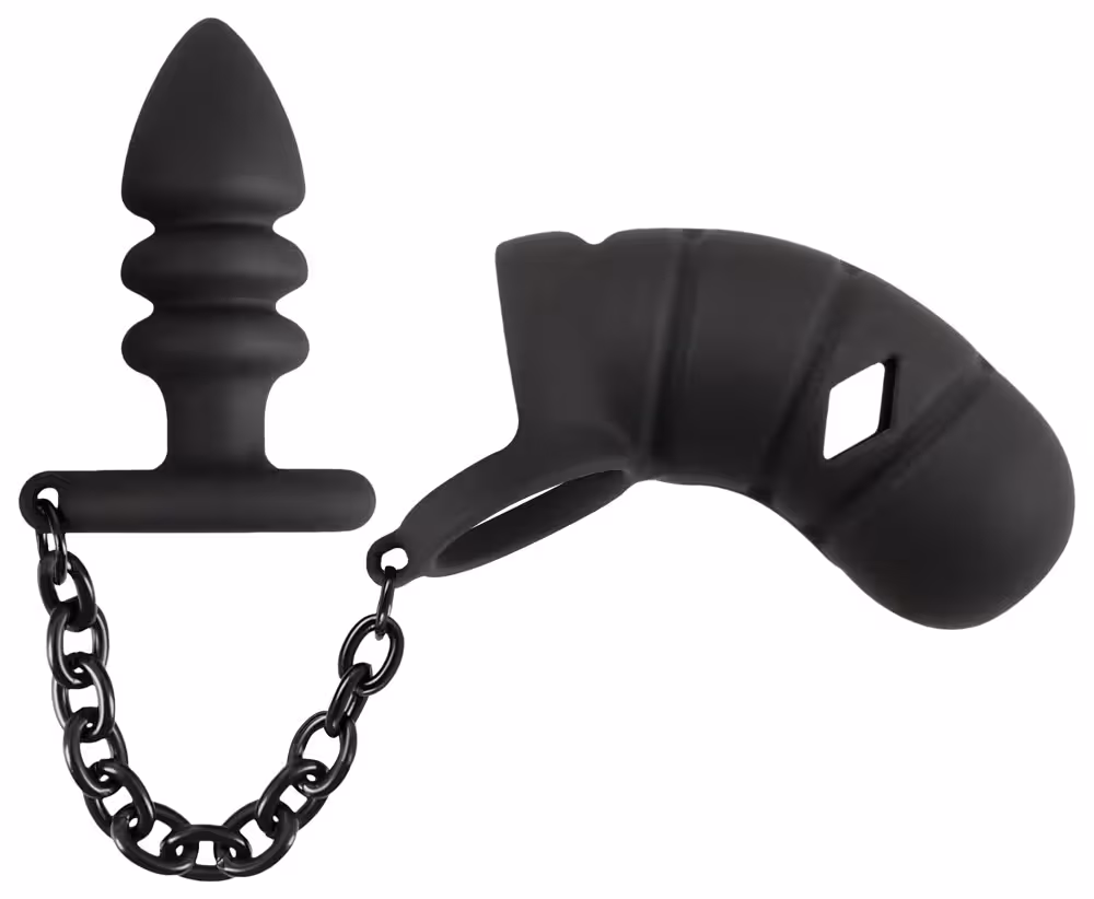 Cock cage with butt plug von Black Velvets kombiniert einen Peniskäfig mit einem Hodenring und verbindet diesen über eine robuste Kette mit dem ausgeprägt geriffeltem Analplug. Neben grandiosem Trage-Feeling auch ein höchst erregender Anblick und aufregendes Accessoire für Kontroll- und Keuschheitsspiele.