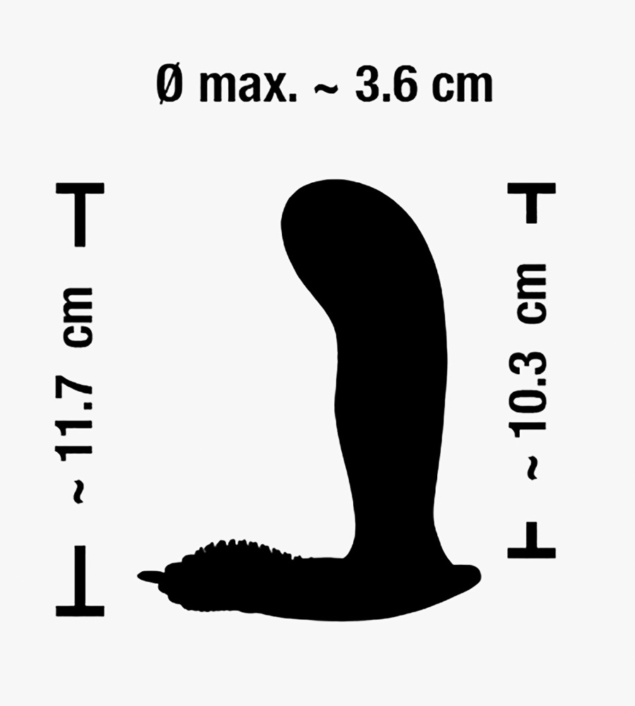 Gesamtlänge 11,7 cm, Einführtiefe 10,3 cm, Ø 2-3,6 cm. Silikon, ABS, PU.