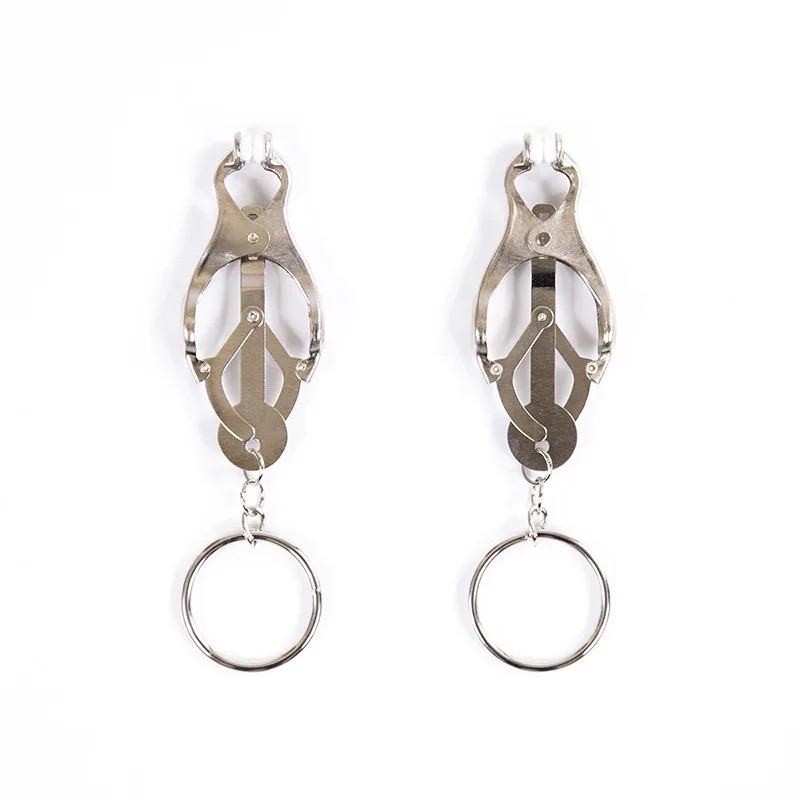 Japanese clover-clamps on chain. They feature a plastic covered mouth, and they´ll pinch a little harder when you pull the chain...