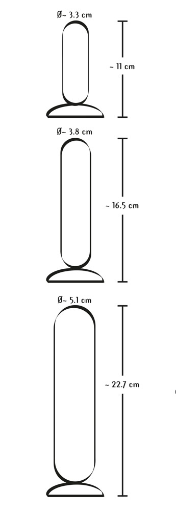 Kleiner Dildo 11 cm lang, Ø 3,3 cm; mittlerer Dildo 16,5 cm lang, Ø 3,8 cm; großer Dildo 22,7 cm lang, Ø 5,1 cm. Material: TPE.