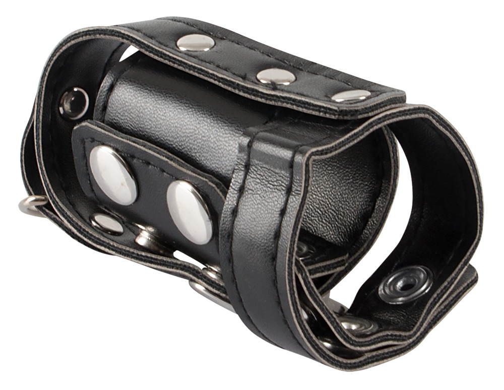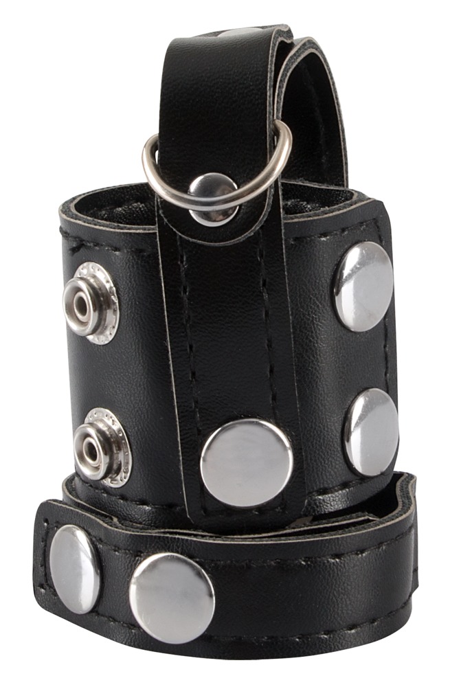 Penis- und Hodenriemen mit Hodenteiler in maskuliner Lederoptik. Mit D-Ring am Hodenteiler zum Anhängen von Gewichten (nicht beiliegend) oder einer Führungsleine (nicht beiliegend). Alle Riemen und der Teiler sind vielfach mit Druckknöpfen für perfekte Passform verstellbar.
