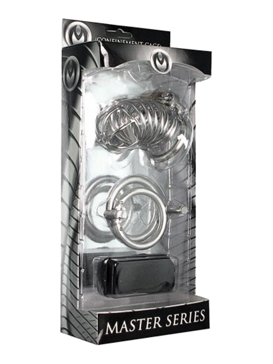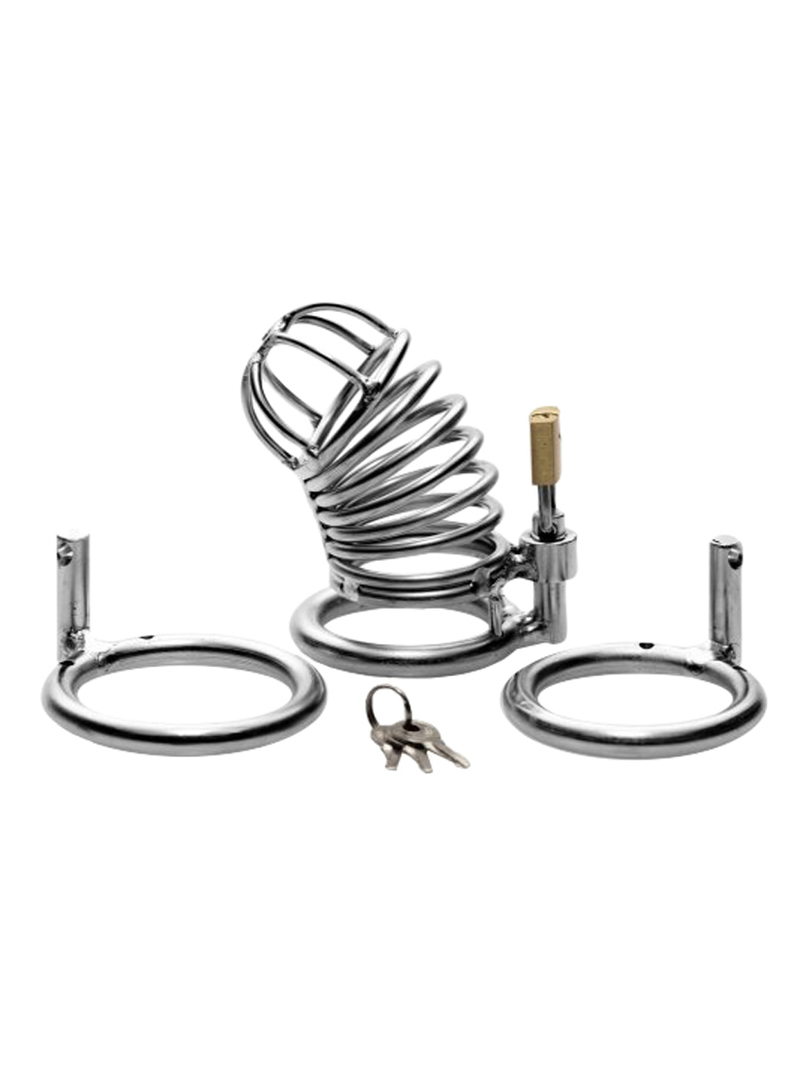 Hat Ihr ungezogener Sklave zu viel Freiheit genossen? Halten Sie mit diesem eindringenden und einsperrenden Stück Ihren Flüchtigen hinter Schloß und Riegel! Verschließen Sie ihn in Unterwerfung durch das Auswählen von einem vom drei verschieden großen Ringen und dem Platzieren des Käfigs über dem Penis-Schaft. Ohne den Peniskäfig würde hier die Stimulation ansetzen. Seine Männlichkeit wird wehrlos eingesperrt in dieser Festung aus Stahl. Eine volle Erektion ist nun nicht möglich: Seine Befriedigung ist begrenzt, was ihn angenehm gefügig und geil hält. Es lebe die Vorherrschaft!