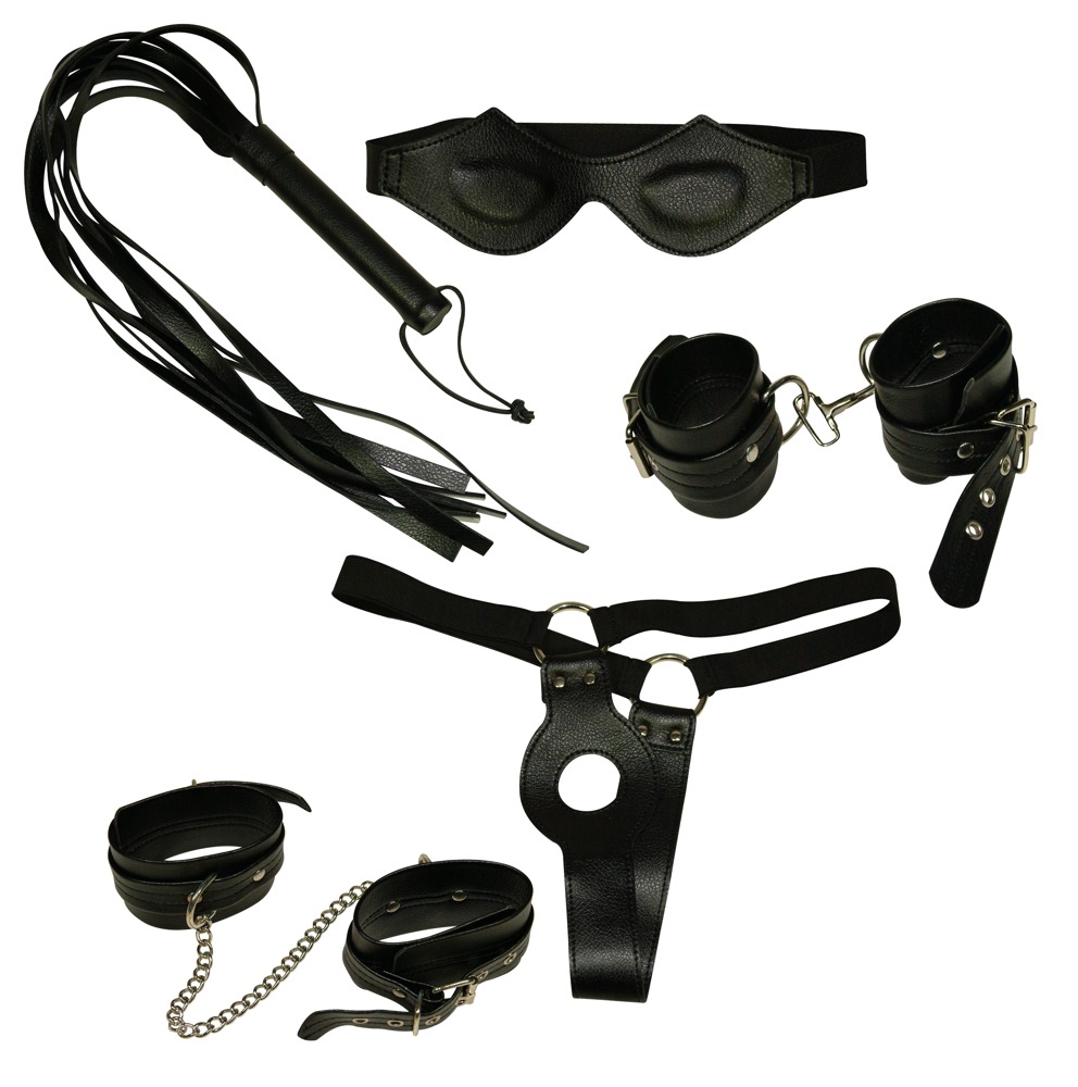 Nutze die Handfesseln, Fußfesseln, die Augenmaske, den String und besonders die Peitsche, um Dich in ganz neue Lustabenteuer zu begeben.