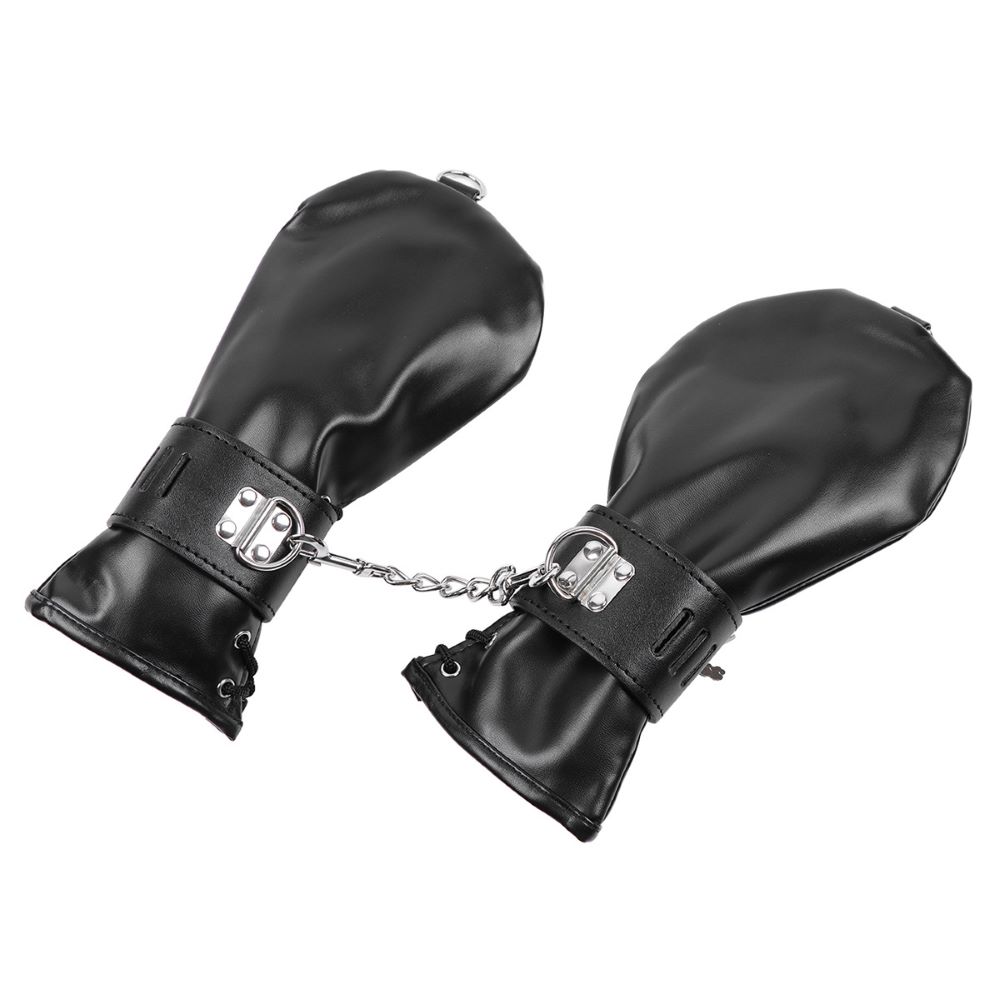 Ein Fausthandschuh aus PU-Leder. Mit sicherem Fesselriemen und Schnürung um das Handgelenk.