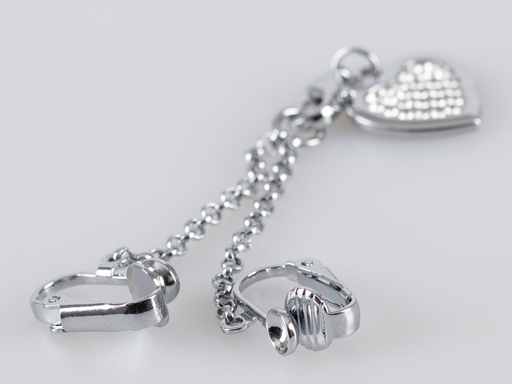 Silberfarbene Intimkette mit strassbesetztem Herzanhänger und Schamlippenspangen.