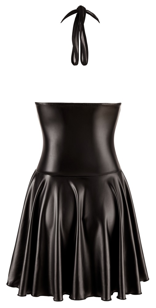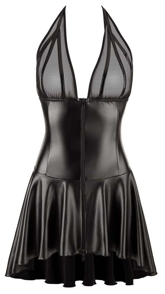 Kurzes Kleid von NOIR in enger taillierter Schnittführung mit ausgestelltem Röckchen. Im schwarzen edlen Mix aus weichem Powernet mit Lack-Details (Oberteil) und Powerwetlook (Rockteil). Vorne mit durchgehendem 2-Wege-Reißverschluss vom Dekolleté bis zum Saum. Rückenfrei - der Neckholder ist zum Binden. Der ausgestellte Rock ist vorne etwas kürzer geschnitten als hinten.