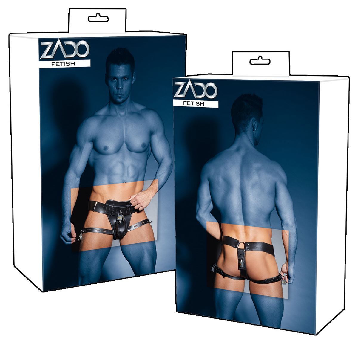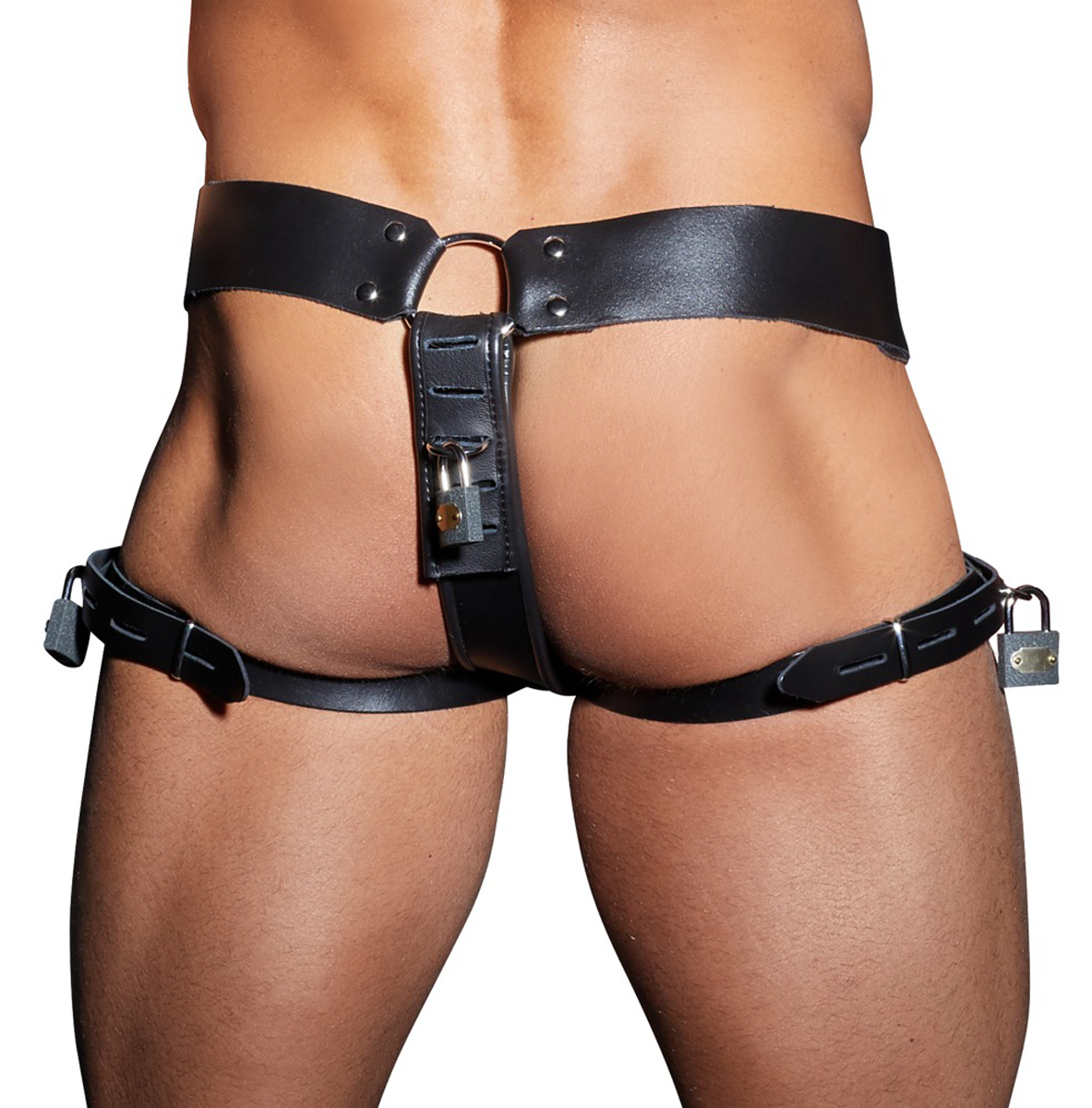Raffinierter Keuschheits-String/-Jock aus schwarzem Leder mit Vorhängeschlössern vorne, hinten und seitlich. Splatleder, Leder, Metall.