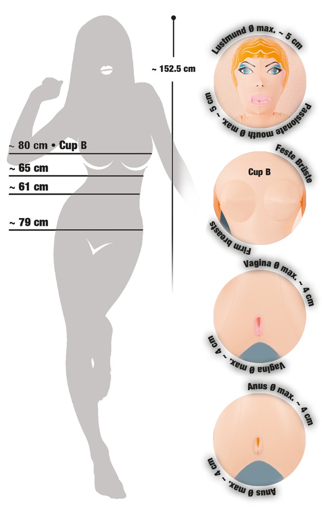 Diese wunderschöne Dame, mit dem aufgedruckten Gesicht und Haaren, hat 3 einladende, enge Liebesöffnungen.