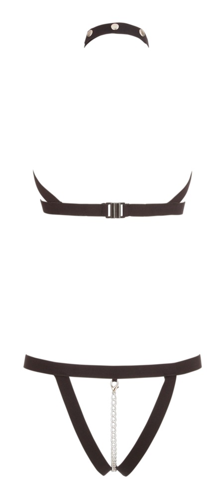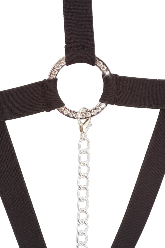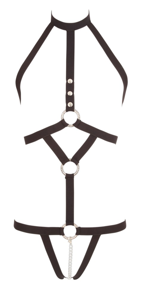 Dieser schwarze Riemenbody aus weichen Webriemen begeistert mit funkelnden Strassringen in der Front sowie dekorativen Druckknöpfen im Steg und am Halsriemen.