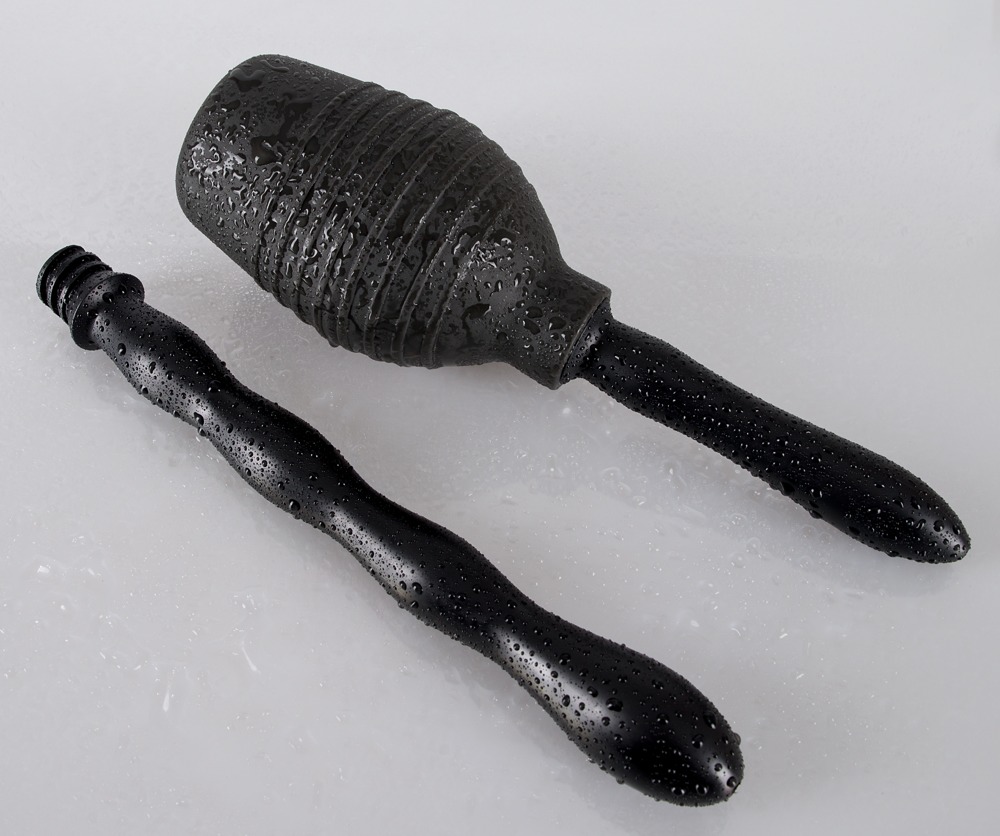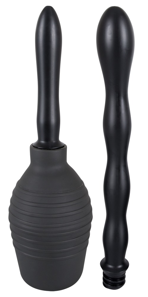 Schwarze Intimdusche (13 cm hoch, Fassungsvermögen 300 ml) mit zwei austauschbaren Schraub-Aufsätzen mit Spritzdüsen. Einfach zu reinigen. Langer, gewellter Aufsatz: Gesamtlänge ca. 23 cm, Ø 1,7-3 cm. Kurzer, glatter Aufsatz: ca. 11,5 cm lang Ø 1,9-2,3 cm). Material: PVC.